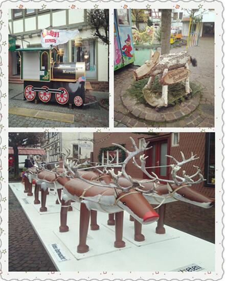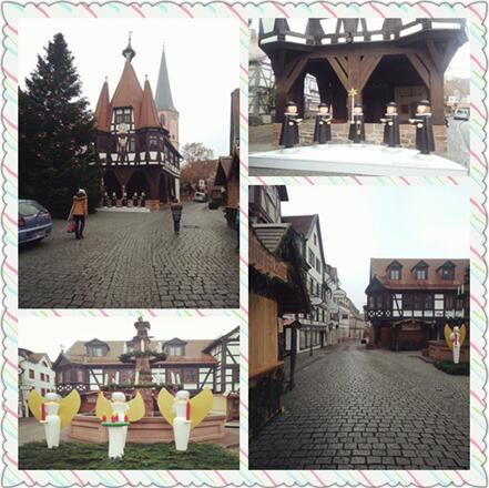 轉(zhuǎn)天早上我們前往米歇爾斯塔德(MICHELSTADT),它是奧登森林區(qū)一個挺出名的木工藝小鎮(zhèn)。伴隨著淅瀝瀝的小雨我們來到了這里。小鎮(zhèn)的街道沒有柏油路,縫縫補(bǔ)補(bǔ)的石磚反映出不同的年代。我們參觀位于廣場對面的市政廳,那近乎橙紅色的頂子是哥特式建筑,建于1484年。我們來的時候鎮(zhèn)子上的人正在準(zhǔn)備即將開放的圣誕市場,挨家挨戶售賣的東西別致而有新意。